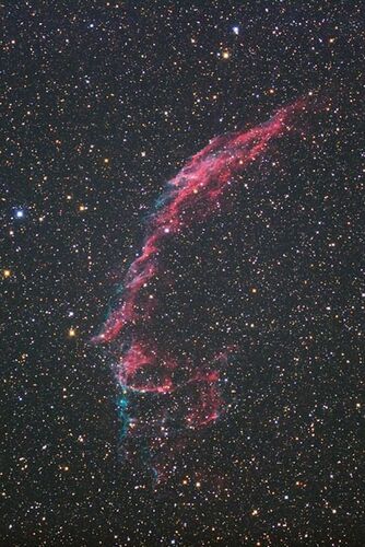 はくちょう座の東側の翼の辺りにこんな星雲が潜んでいます↓ 【NGC6992~6995】 キヤノンEOS Kiss Digital X + 口径18cm写真撮影用反射望遠鏡 ISO800 F2.8 総露出時間40分(4分×10コマ加算合成)トリミング [8月16日 山梨県小菅村にて撮影] 繊維状…