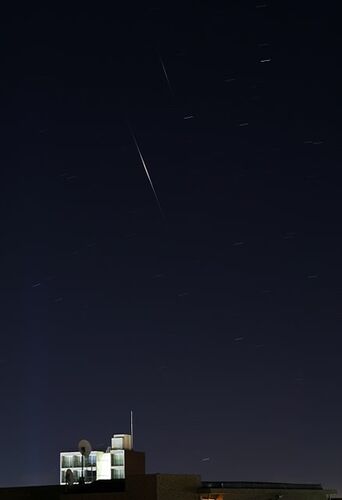 土曜日の未明に自宅ベランダにてこんな写真が撮れました(↓)。 キヤノンEOS Kiss Digital X + 28-75mmズームレンズ(48mmに設定)使用 ISO100 F4.0 総露出時間2分(30秒×4コマ比較明合成) 三脚使用 横線状に写っているのは普通の星ですが、それとは異質な2つの光…