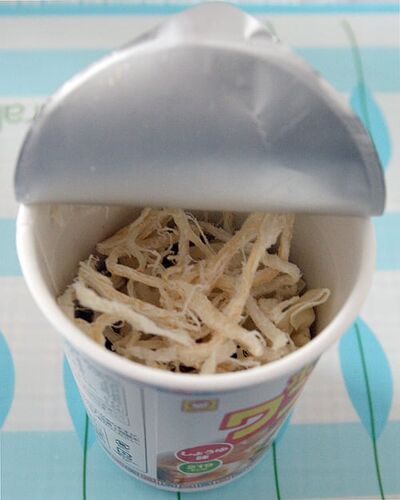 久々のちょい足し食材ネタです。例によって情報元は某TV番組(2月放送分)です。 お湯を注ぐだけでできるカップワンタンに、酒のつまみの定番でもある「さきイカ」を入れると美味しいというので試してみました。ちょい足し方法は、まずフタを開けて小皿1杯分…