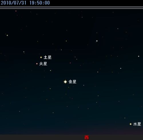 このところ夕方の西空に惑星たちが集って賑やかになってます。 その中で火星と土星が今月末から来月初頭にかけて非常に接近して見えます。 で、最接近日となる7月31日の西空の状況がこちら↓ Astroarts ステラナビゲータによるシミュレーション 両者の隔たり…