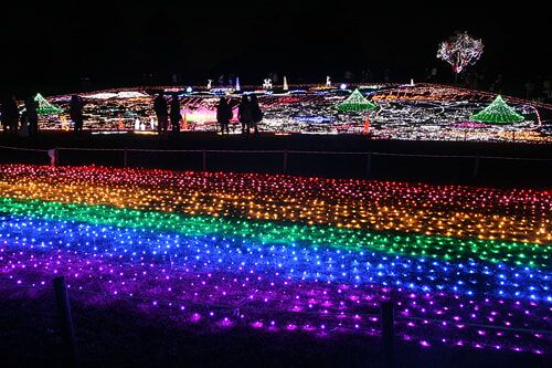 国営昭和記念公園で開催中のイルミネーションイベントの続編ネタです。 一番の見ものである「グラウンドイルミネーション」のほぼ全景がこちら↓ 手前側の虹をイメージした電飾がカラフルでとっても綺麗です。 色数が少なくて寂しかった昨年とは大違い。 その…