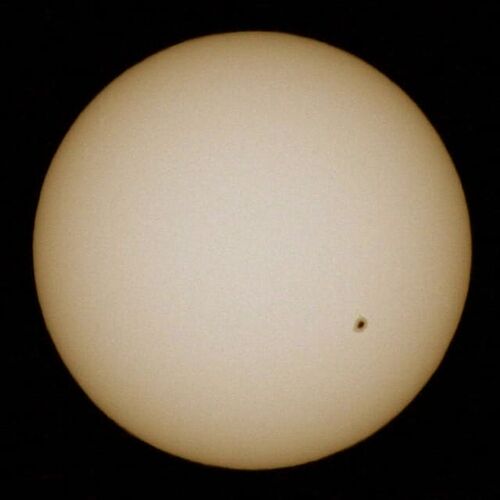 4月中旬に見えていた大きな黒点が、太陽の自転により再び前面に戻ってきてました↓ キヤノンEOS Kiss Digital X + 400mm超望遠レンズ (太陽撮影用減光フィルターND100000使用,擬似カラー処理) 先月より小さくなりましたが、まだ肉眼で確認可能です。巨大だ…