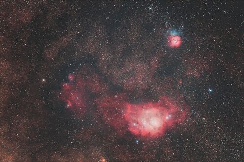 金曜日の晩、埼玉-山梨-長野の県境あたりで晴れ間が期待できそうだったんで、いそいそと☆撮りに出撃。思ったより雲が多かったものの、月が沈んでからは晴天域が広がってくれました。で、まずはいて座の濃密な天の川の一角に並ぶこの星雲群を撮影。 【三裂星…