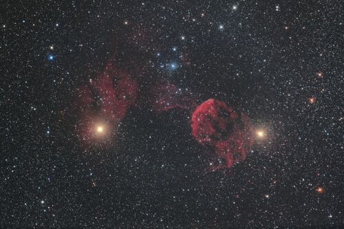 先の日曜日の未明に撮っていた天体の画像処理がようやく終わりました。 【くらげ星雲(IC443)付近】 キヤノンEOS Ra+タカハシε-180EDC,F2.8,ISO1600,ASTRO LPR Type2フィルター使用, 総露出時間60分(4分×15コマ,加算コンポジット),タカハシEM-200Temma…
